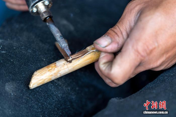 图为芦笙造做脚优伶梁光林正在给芦笙管簧片焊锡。吴德军 摄